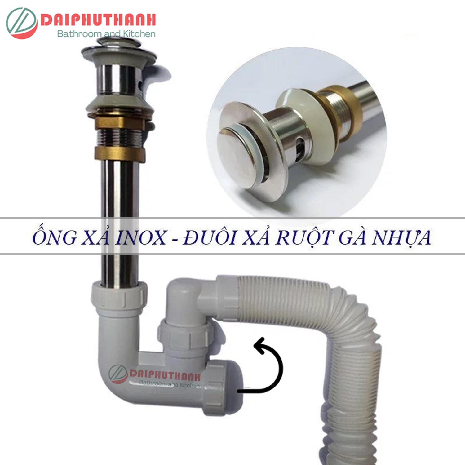 - TRỤ INOX - ĐUÔI NHỰA: Phần trụ ống xả Inox, đuôi xả Nhựa, ty nhấn đồng thau