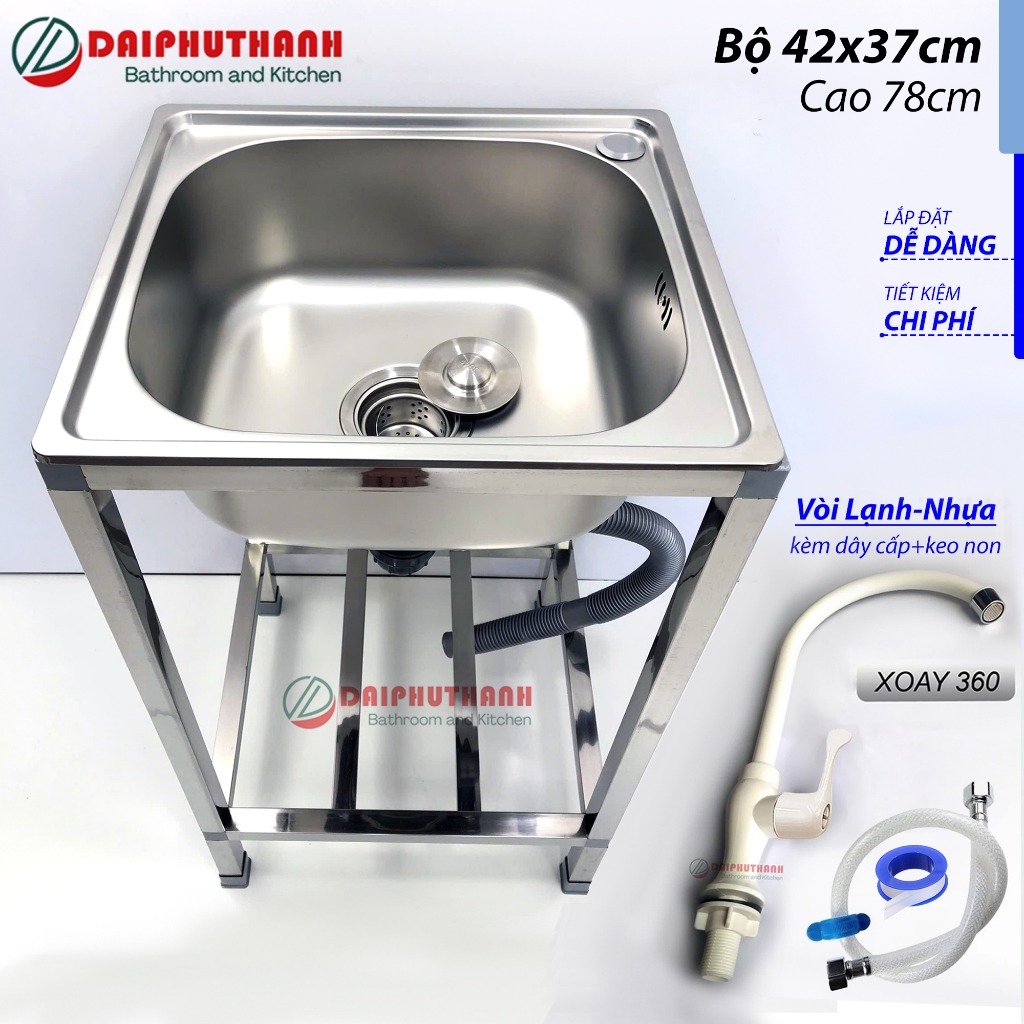 Chậu Rửa Chén Bát Inox Có Chân Lắp Ráp, gồm những món chính sau:Món 1. Chậu rửa bát Inox 1 hộc:-Kích thước, gồm 2 lựa chọn: 42x37cm và 50x40cm-Chất liệu: Inox SUS201, độ dày tương đối-Kiểu chậu dập, góc bo tròn, dễ vệ sinh-Đáy chậu phủ chống ồn hiệu quả, kèm đủ xi phông.Món 2. Kệ chân chậu lắp ráp inox 20-Kích thước tương ứng với mặt chậu, chiều cao 78cm-Dễ lắp đặt, dễ sử dụng, có tặng kèm theo phụ kiện hỗ trợ lắp đặt.Món 3. Vòi rửa bát nước lạnh:-Vòi LẠNH-NHỰA, xoay 360, tặng dây cấp inox, keo non.-Chất liệu vòi Nhựa chống gỉ sét, chân vòi đúc không lo gỉ nước.Lưu ý:-Có thể lựa chọn KHÔNG LẤY VÒI nếu nhà có sẵn vòi, hoặc muốn đổi mẫu vòi.-Bộ sản phẩm có giá thành khá mềm, chất lượng ổn, phù hợp phòng trọ, làm bồn rửa phụ,..-Quý khách vui lòng xem kĩ thông tin và hình ảnh sản phẩm để tránh nhầm lẫn khi đặt hàng.