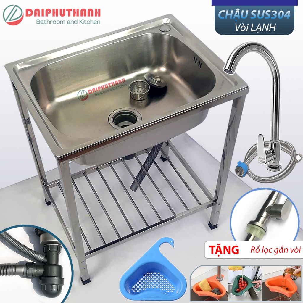 COMBO Chậu Rửa Chén Bát 1 Hộc Inox SUS304 Có Chân 60x45cm, gồm những món chính sau:1. Chậu rửa bát Inox 1 hộc SUS304:-Kích thước: Dài 60cm, Rộng 45cm, loại chậu 1 hộc rửa rộng rãi-Chất liệu: Inox SUS304, cứng cáp, độ dày tương đối-Kiểu chậu dập, góc bo tròn, dễ vệ sinh-Đáy chậu phủ chống ồn hiệu quả, kèm đủ xi phông.2. Kệ chân chậu lắp ráp inox 201, kích thước tương ứng với mặt chậu, chiều cao 81cm, dễ lắp đặt, dễ sử dụng, kết cấu chắc chắn, khả năng chịu lực cao.3. Vòi rửa bát, gồm 2 lựa chọn:*Vòi inox NÓNG LẠNH phủ Crome bóng, 2 chế độ, thân xoay 360, kèm đủ dây cấp*Vòi inox LẠNH, xoay 360, tặng dây cấp inox.-Khi chọn mua Combo đủ bộ (có vòi) tặng 1 rổ lọc rác gắn vòi tiện dụng.Lưu ý:-Có thể lựa chọn KHÔNG LẤY VÒI nếu nhà có sẵn vòi, hoặc muốn đổi mẫu vòi.-Quý khách vui lòng xem kĩ thông tin và hình ảnh sản phẩm để tránh nhầm lẫn khi đặt hàng.