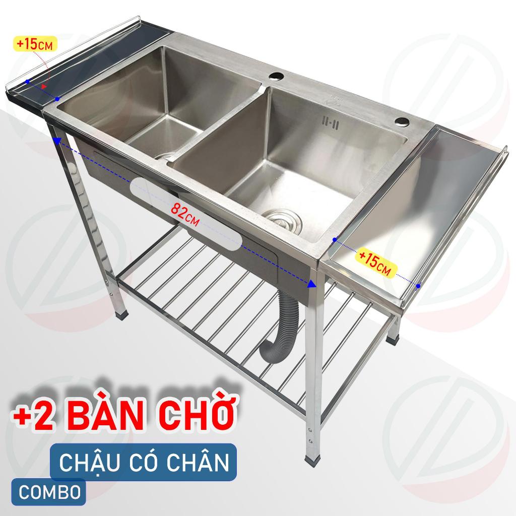 COMBO Chậu Rửa Chén Bát Có Kệ Chân, Thêm 2 Bàn Chờ, gồm các món chính sau:Món 1: Chậu rửa bát inox cao cấp sus201 (đủ xi phông), có nhiều lựa chọn kích thước:- Chậu 1 hộc 60x45cm, chất liệu inox dày dặn, kiểu chậu vuông vứt- Chậu 1 hộc 82x45cm, chất liệu inox dày dặn, kiểu chậu vuông vứt- Chậu 1 hộc 90x50cm, chất liệu inox dày dặn, kiểu chậu vuông vứt- Chậu 2 hộc 82x45cm, chất liệu inox dày dặn, kiểu chậu vuông vứt- Chậu 2 hộc 100x50cm, chất liệu inox dày dặn, kiểu chậu vuông vứt*Lưu ý:- Kích thước trên là kích thước của chậu, chưa bao gồm phần 2 bàn rời (15cm) x2- Bộ sản phẩm chưa bao gồm Vòi nước và dây cấp nước.Món 2: Kệ chân chậu lắp ghép, inox 201, chiều cao 81cm, có kích thước tương ứng với từng chậu, khả năng chịu lực cao.Món 3: Bộ 2 bàn chờ (cánh rời) inox 201, lắp 2 bên chân chậu:- Kích thước 1 bàn: 15cm; (2 bàn ra thêm 30cm)- Dễ lắp đặt, có thể tháo rời, linh hoạt, dễ sử dụng- Phụ kiện này có thể giúp cho bộ chậu rộng thêm 15cm (1 bàn), có thêm không gian để dụng cụ, chai lọ.