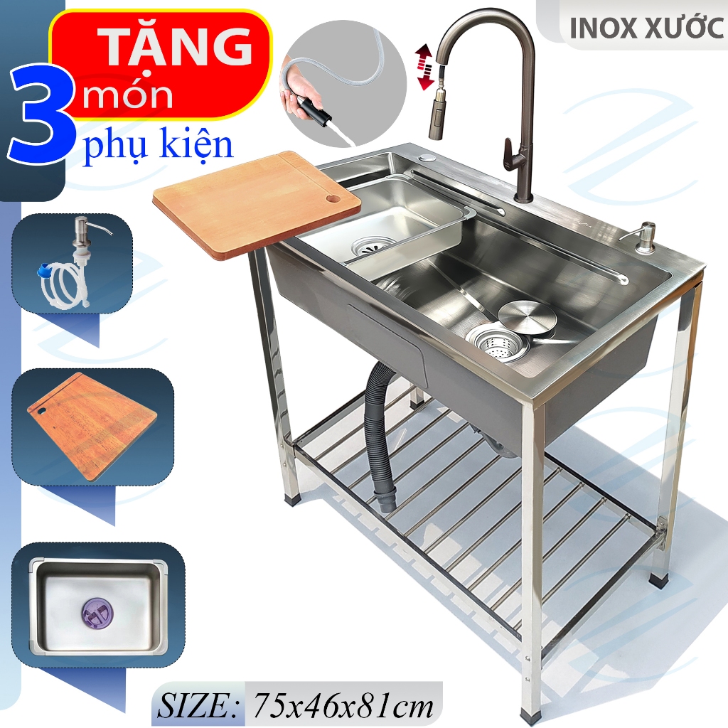 COMBO Chậu Rửa Bát Có Chân Kazta, bao gồm những món chính sau:Món 1: Chậu rửa bát Inox Xước 75x46cm (Dài x Rộng), đầy đủ xi phông:● Chất liệu gồm 2 lựa chọn: Inox 201 hoặc inox 304● Chậu loại 1 hộc rửa, khá rộng rãi, đáy chậu phủ sơn và lớp cao su chống ồn hiệu quả, chống ẩm mốc● Tặng kèm 1 khay inox và 1 thớt gỗ, vô cùng tiện ích.Ngoài dòng chậu thông dụng chất liệu inox 201, còn có lựa chọn dòng inox 304 cao cấp hơn, bền hơn.Món 2. Kệ chân chậu lắp ráp, Inox 201, kích thước 75x46cm, chiều cao 81cm, khả năng chịu lực cao.Món 3. Vòi rửa bát nước lạnh Inox phủ nano, kiểu đầu vòi dây rút, có thể kéo ra thu vào, 2 chế độ xịt rửa mọi vị trí, tiện lợi, sang trọng, có thể chọn ''KHÔNG LẤY VÒI''*KHI chọn mua phân khúc combo ''KHÔNG LẤY VÒI'', Quý khách chỉ được tặng kèm 2 món phụ kiện: khay inox và thớt gỗ.*KHI chọn mua phân khúc combo ''ĐỦ BỘ CÓ VÒI'', Quý khách được tặng kèm bộ 3 món phụ kiện: khay inox, thớt gỗ và vòi xịt xà bông, hút nước rửa chén.#chauruabatcochan #bochauruacochan #combochauruabatcochan #kazta